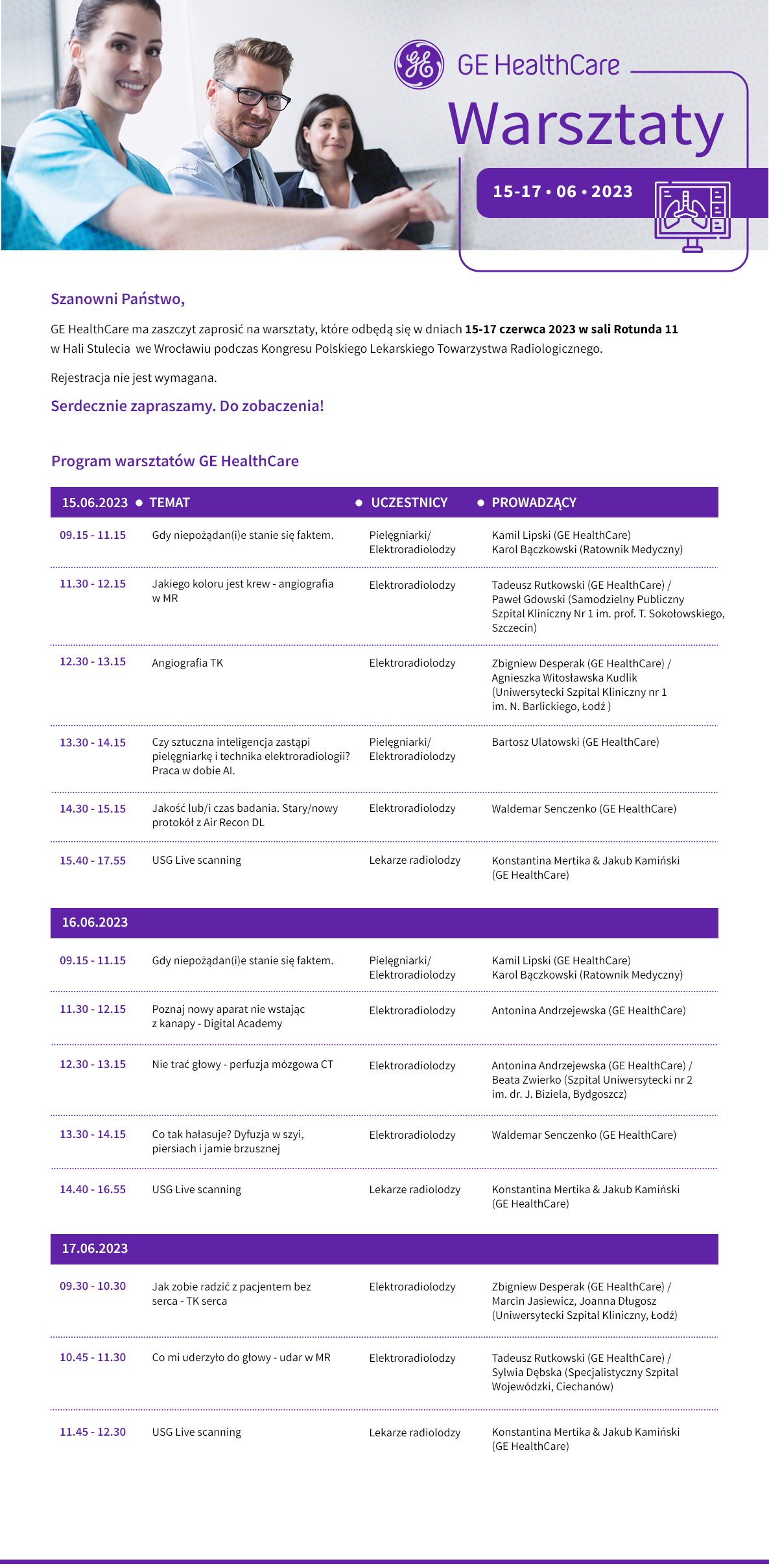 WARSZTATY FIRMY GE HEALTHCARE Miejsce: Rotunda 11 (Hala Stulecia) W celu udziału w wybranym warsztacie prosimy o przybycie pod salę Rotunda 11 przed czasem rozpoczęcia warsztatu.Ilość miejsc ograniczona, obowiązuje kolejność zgłoszeń na miejscu.